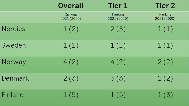 The survey is based on interviews with 190 financial institutions in the Nordic countries, of which the 71 largest are classified as Tier 1 and 111 are classified as Tier 2. The firms were asked to rank their banking relationships based on ten different categories, which were then weighed together to form an Overall Performance score.