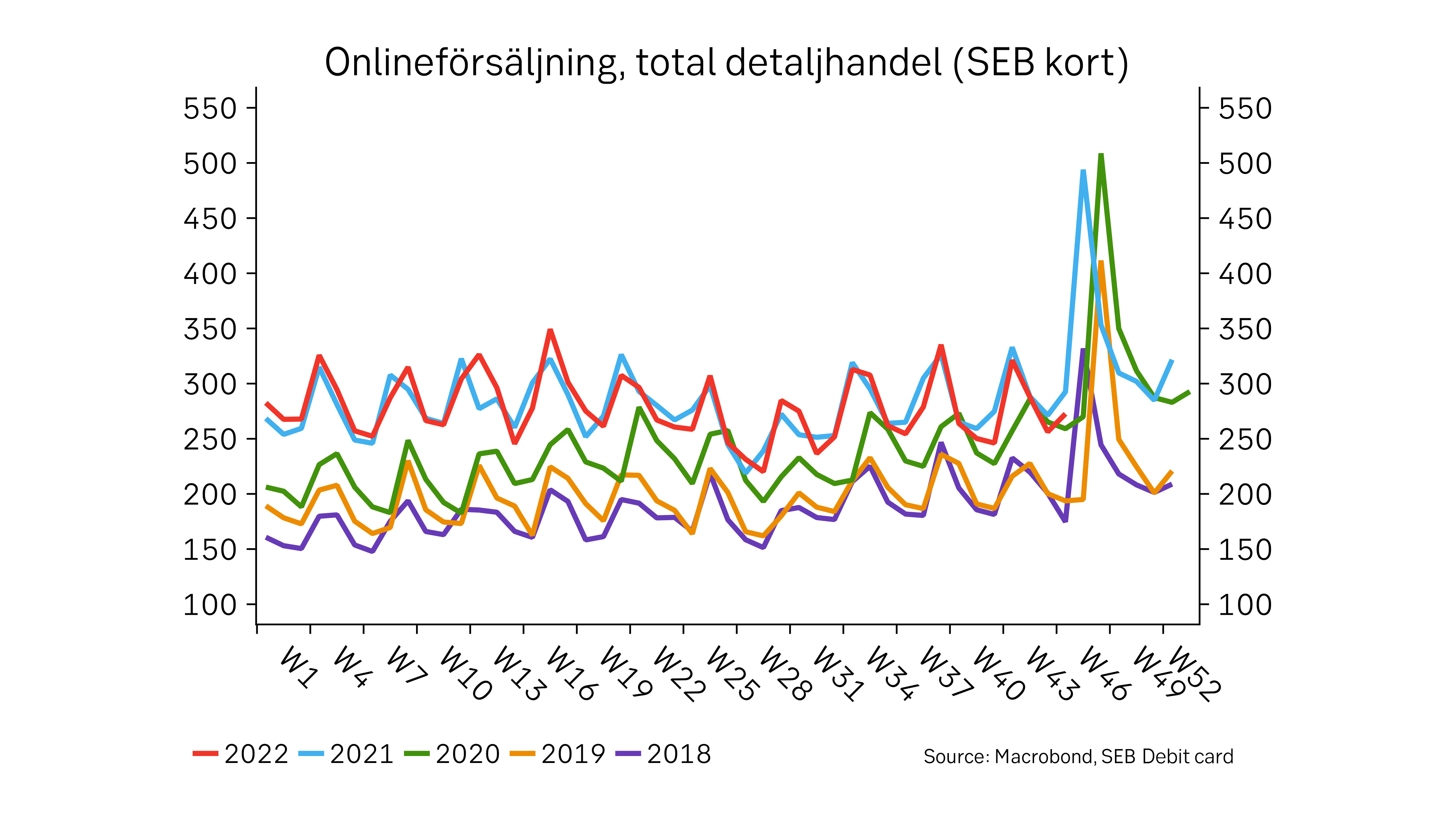 Även om Black Friday har funnits länge bidrog pandemin till att tidsperioden förlängdes som ett sätt att tillgängliggöra handeln när pandemirestriktioner satte käppar i hjulen för den fysiska handeln. Veckotransaktionerna på SEB:s Debitkort visar att omsättningen hålls uppe en bit högre för åren 2020 och 2021 jämfört med 2018.