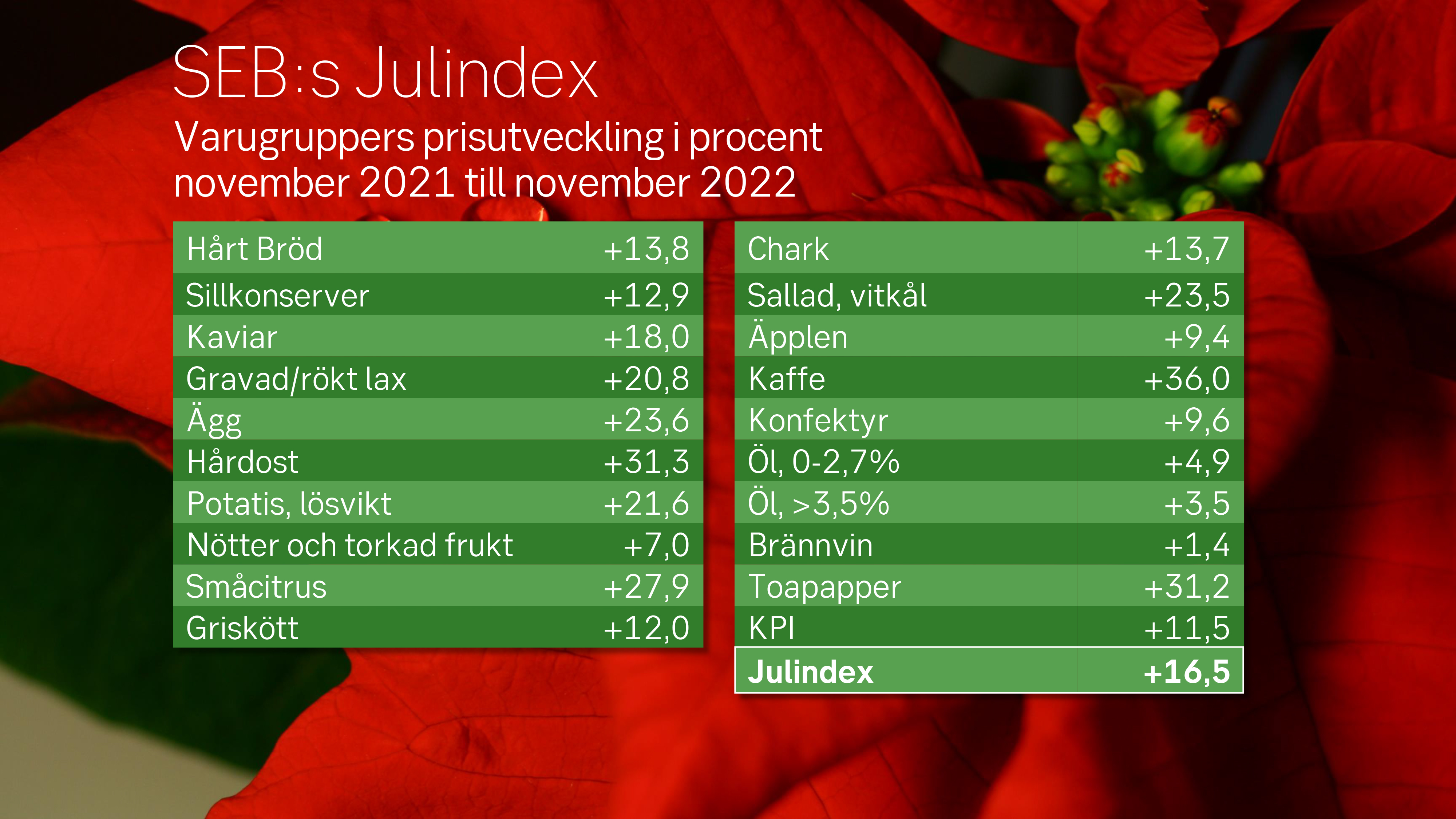 SEB:s julindex utgår från Statistikmyndigheten SCB:s officiella data, och baseras på prisförändringen de senaste 12 månaderna (november 2021 och november 2022). I år har genomsnittspriset för det urval av varor som ingår i SEB:s Julindex stigit med 16,5%, medan priset på den totala livsmedelskorgen ökat med 18% och totala Konsumentprisindex (KPI) stigit med knappt 11,5%.